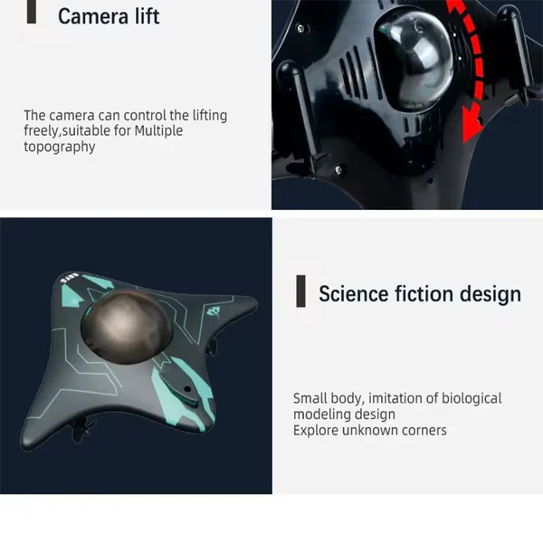 The submarine connects to your smartphone via Wi-Fi, allowing you to control it, view live video, and transfer recordings easily.